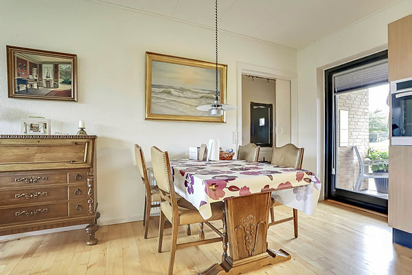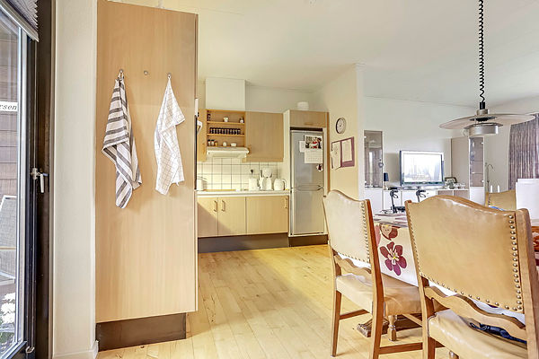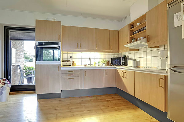 Der er emhætte, glaskeramiske kogeplader, ovn og forberedt for installation af opvaskemaskine, vaskemaskine og tørretumbler.